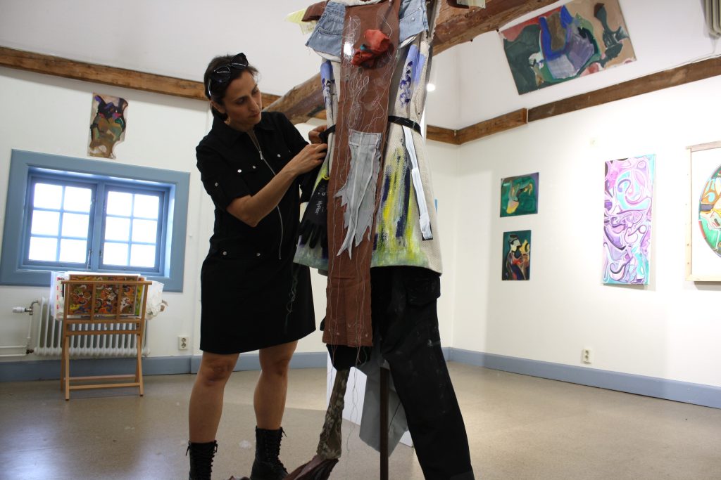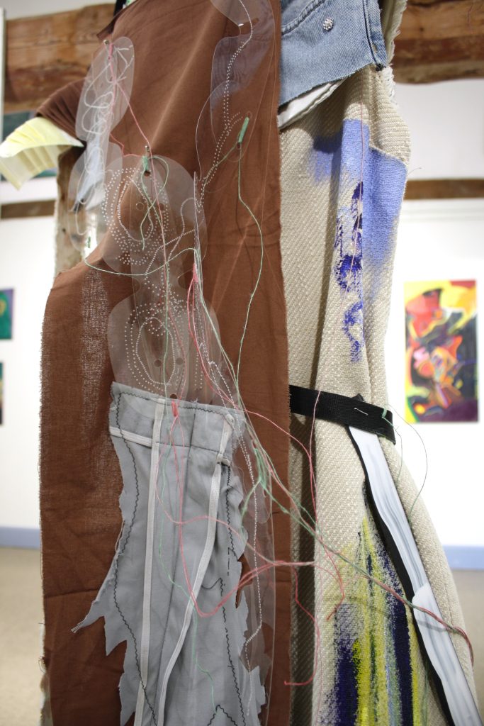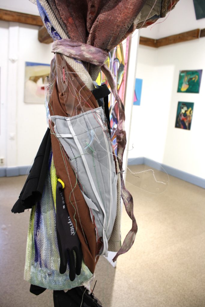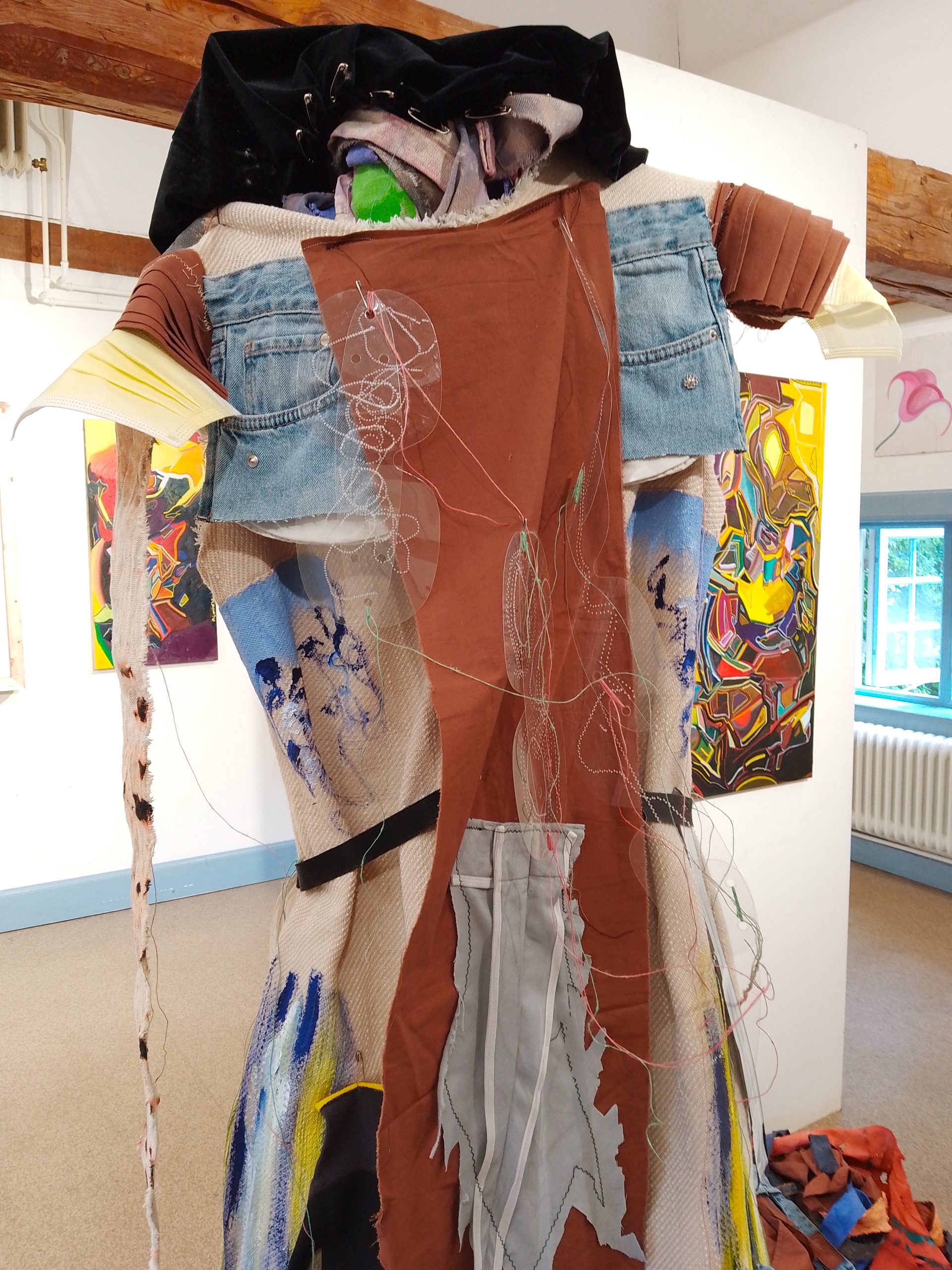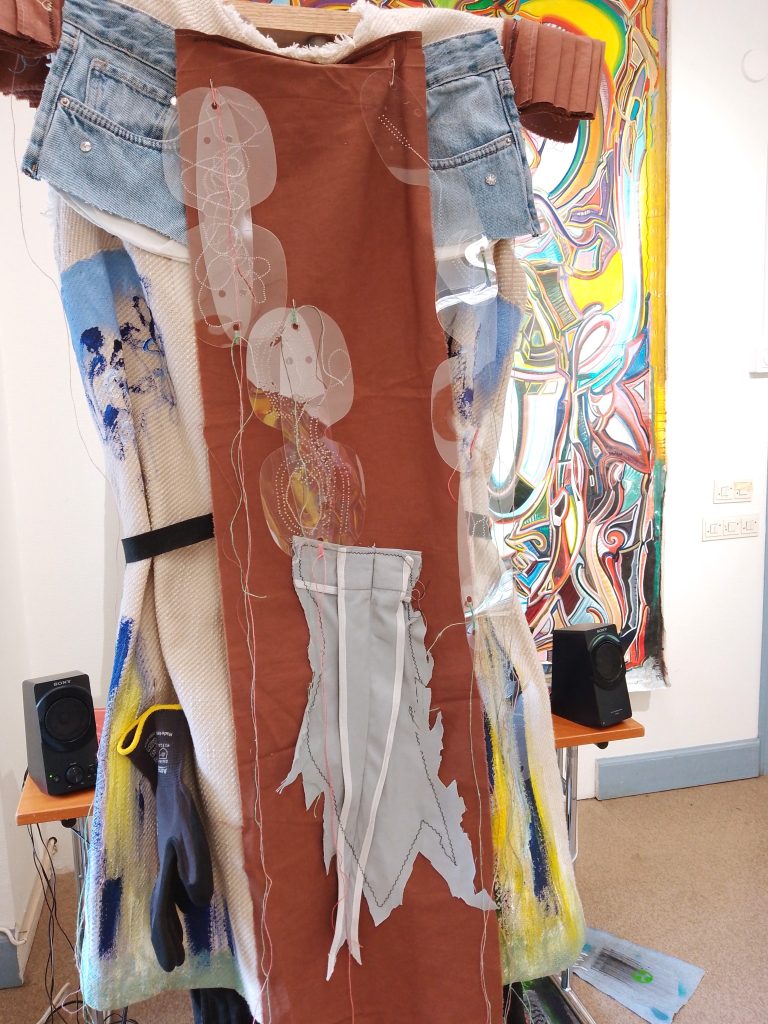 My costume initially stood in the corner of the exhibition space, among Öhlund’s vibrant paintings. It blended upcycled textiles, plastics, with my early work clothes from my work as a facilities technician. The costumes’ transparent reflective plastics interacted with Öhlund’s paintings like shapeshifting, distorted mirrors.