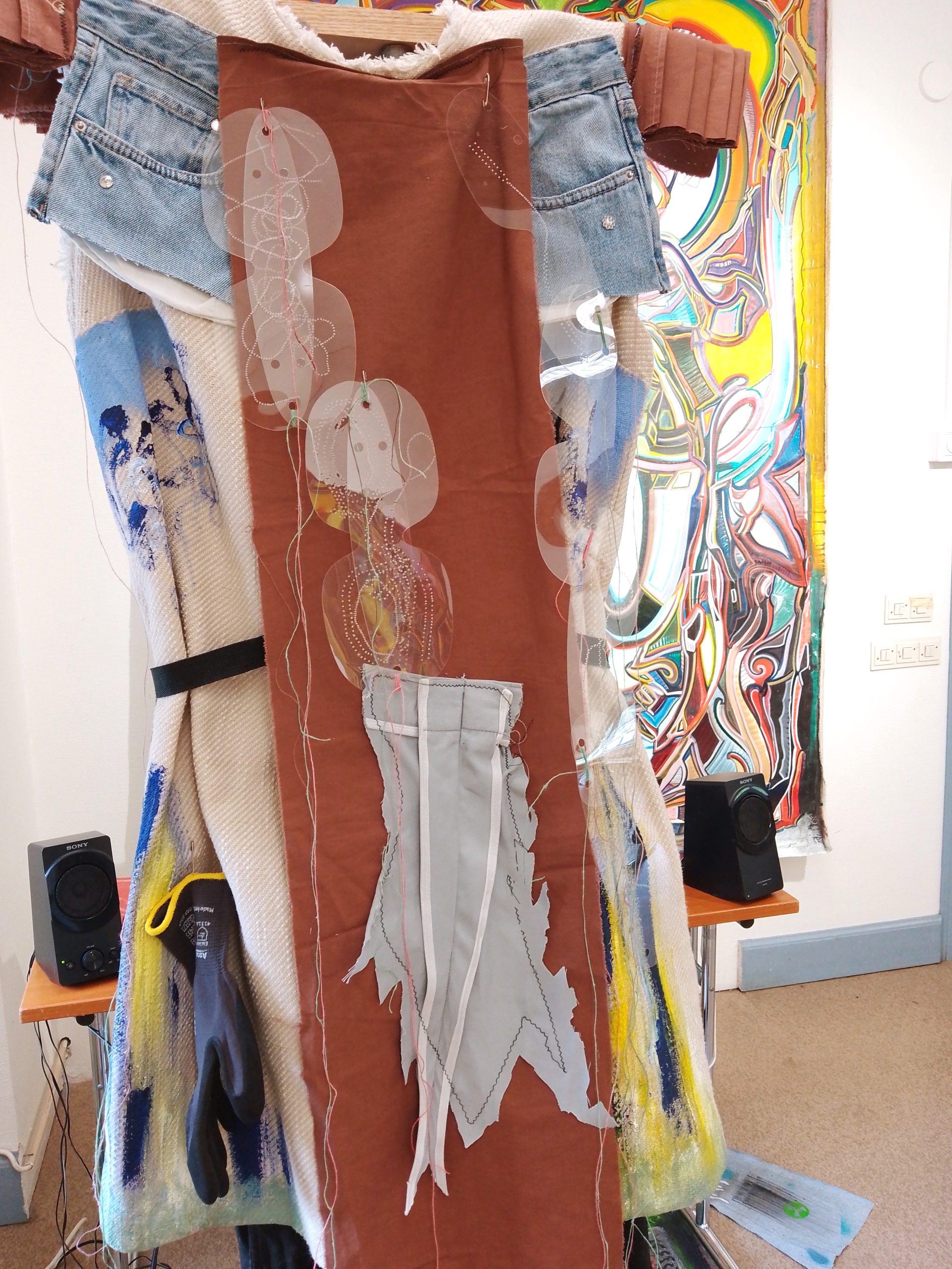 DJ costume-performance Spray paint, acrylic paint, plastics, safety pins, work clothes and various fabrics, including dyed raw fabric. 2025